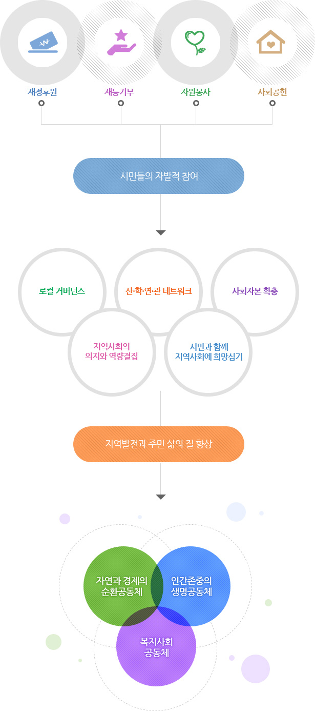시민들의 자발적인 참여와 산학연관 네트워크를 확대·강화함으로써 지역발전과 주민의 삶의 질을 높여 골고루 잘사는 지역공동체를 만들어 갑니다.