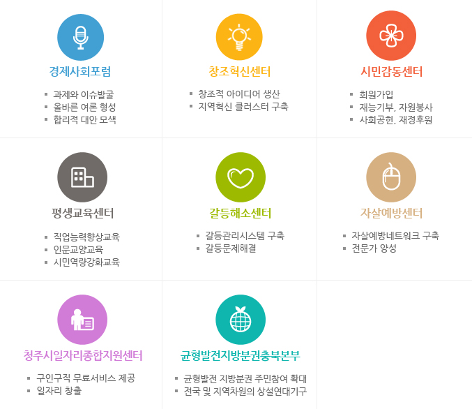 충북경제사회연구원은 설립목적을 위해 다음분야의 ㉠조사연구, ㉡교육 및 컨설팅, ㉢홍보 및 캠페인, ㉣교류협력 및 실천, ㉤시민사회 활성화 및 시민조직, ㉥정부와 지자체의 위탁 사업 등을 전개합니다.
