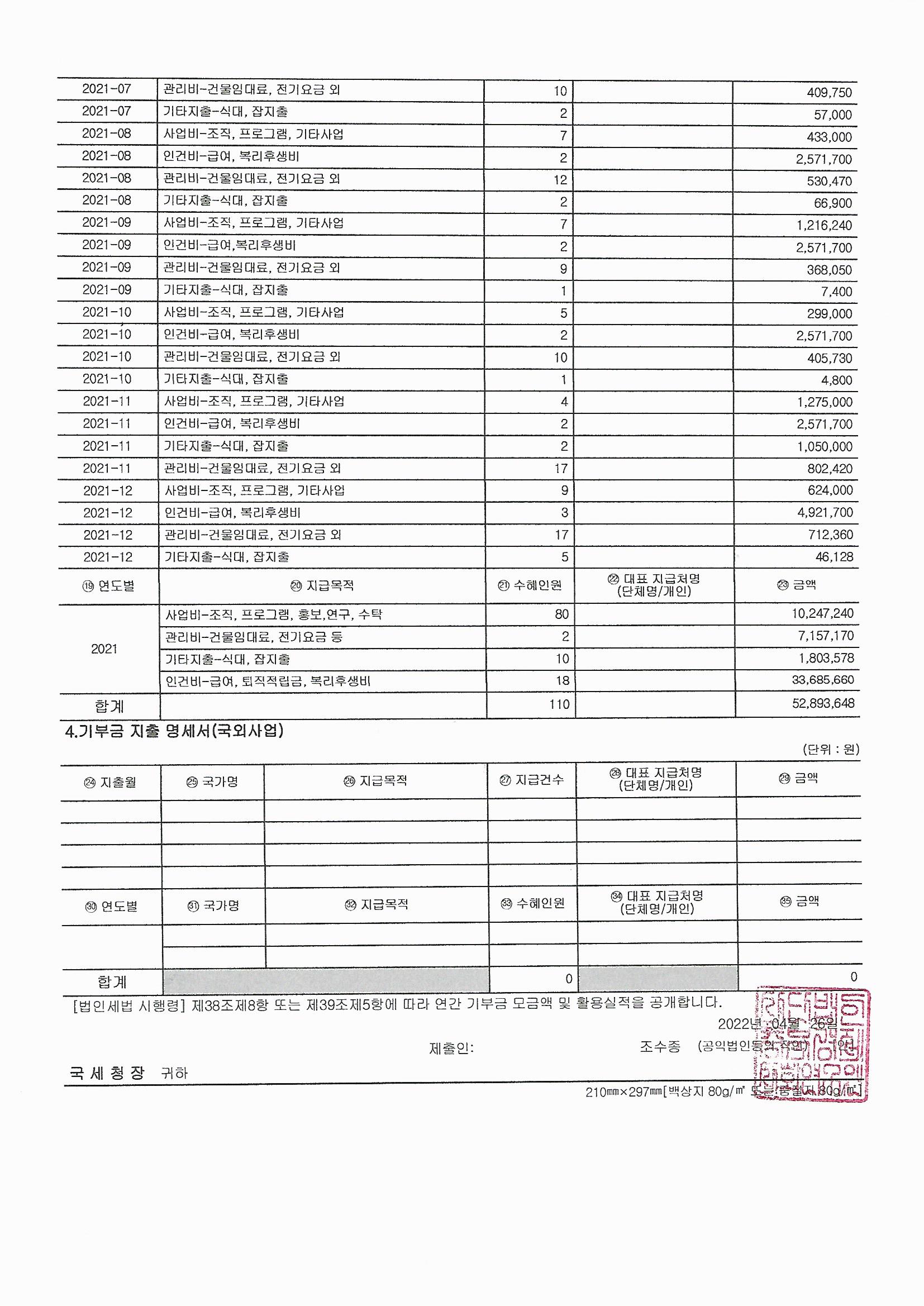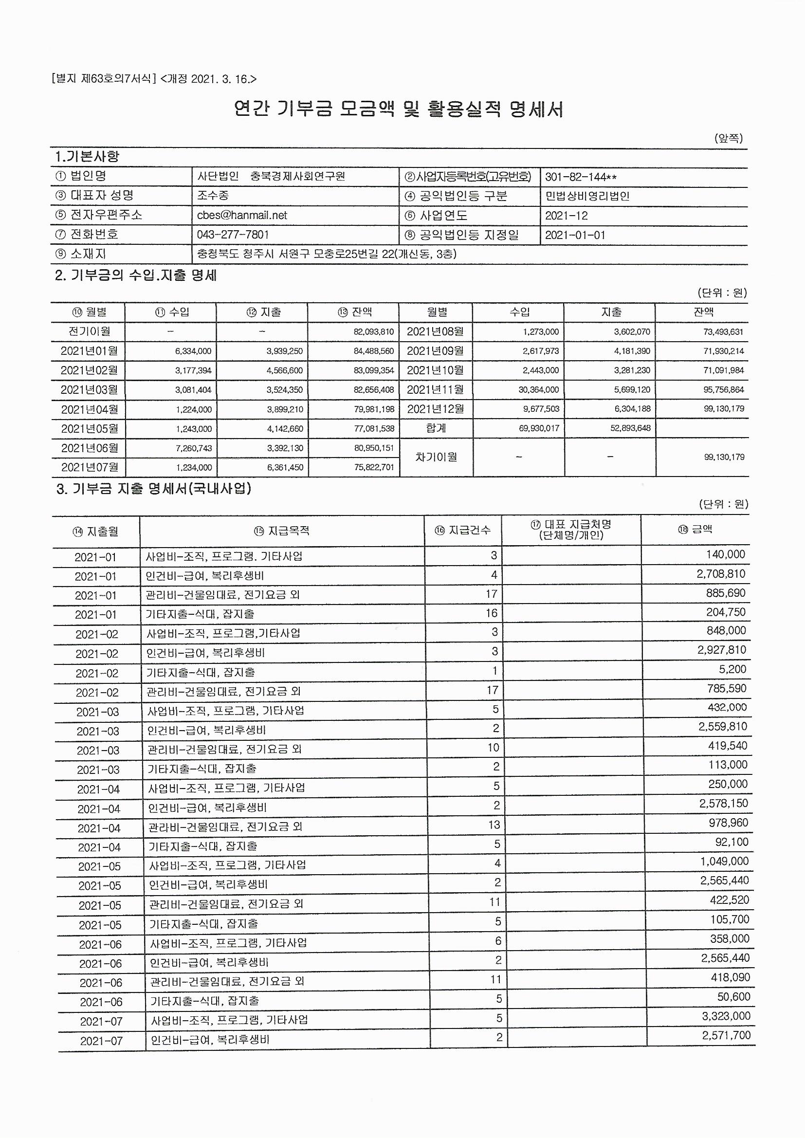 2021년 연간기부금 모금액 및 활용실적 명세서